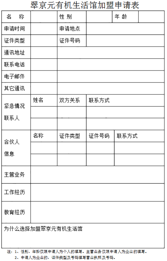 1、申請人需對“翠京元”品牌有高度的認同,對于“有機產(chǎn)品”和“有機生活理念”有高度的認同。2、申請人需為完全民事行為能力人或獨立法人,并向公司總部提交真實的基本信息。 3、申請人需擁有誠信、正直的品格,能夠認真負責(zé)加盟店的運營工作。 4、申請人需具有獨立、穩(wěn)定的經(jīng)濟能力和基本的財務(wù)管理能力。具有一定的組織管理經(jīng)驗,能管理、激勵員工行為。 5、如果申請人為合伙經(jīng)營模式的,申請人在加盟店投入資本中所占比例不低于51%。需向公司出具有效投資占比證明。 6、申請人在達成加盟協(xié)議后,需付清“品牌信用保證金”方可獲得翠京元有機生活館加盟授權(quán)書。 ![]() |
