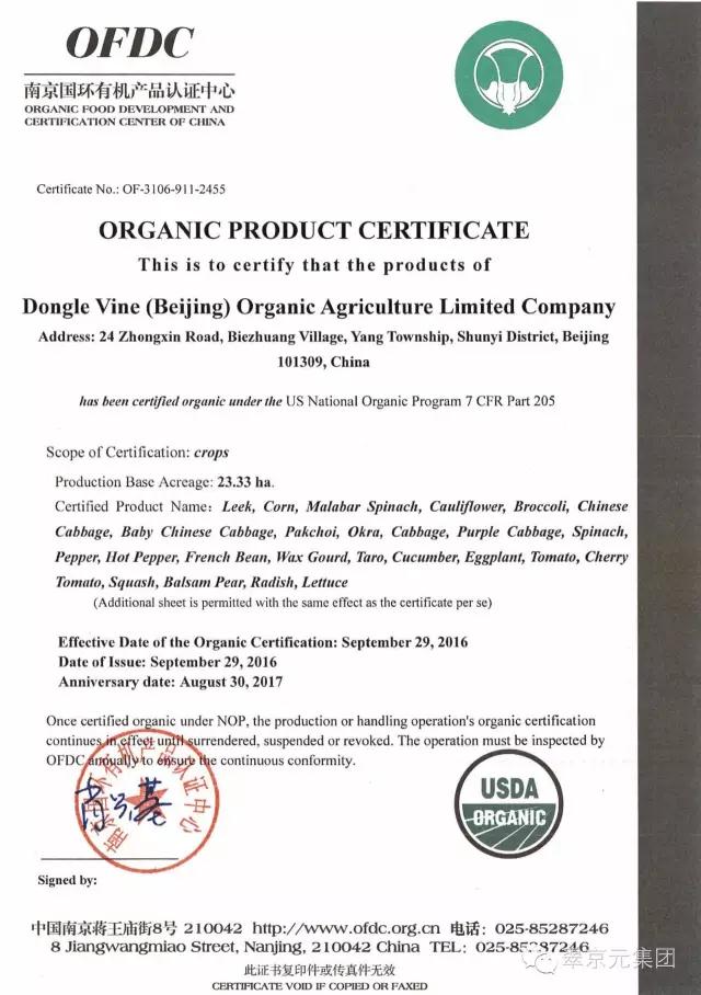 翠京元北京順義有機(jī)基地獲得美國有機(jī)認(rèn)證!