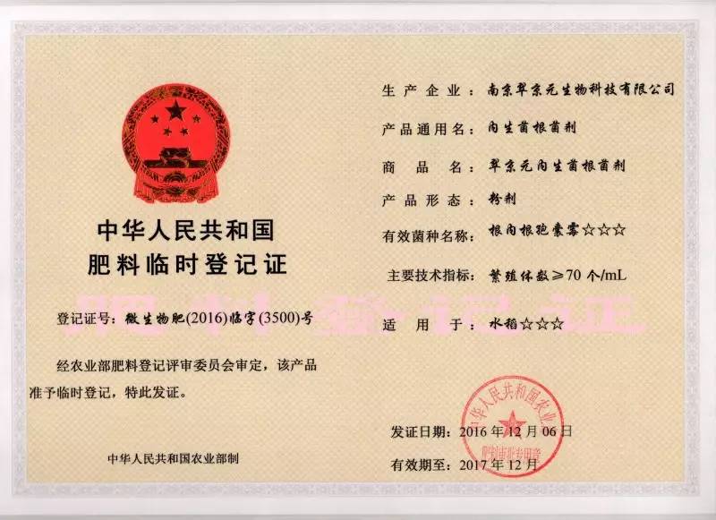 翠京元內(nèi)生菌根菌劑是一款粉劑產(chǎn)品,是國內(nèi)第三家取得內(nèi)生菌根菌劑登記證的產(chǎn)品,農(nóng)業(yè)部登記證號(hào)為:微生物肥(2016)臨字(3500)號(hào),有效繁殖體數(shù)≥70個(gè)/ml。