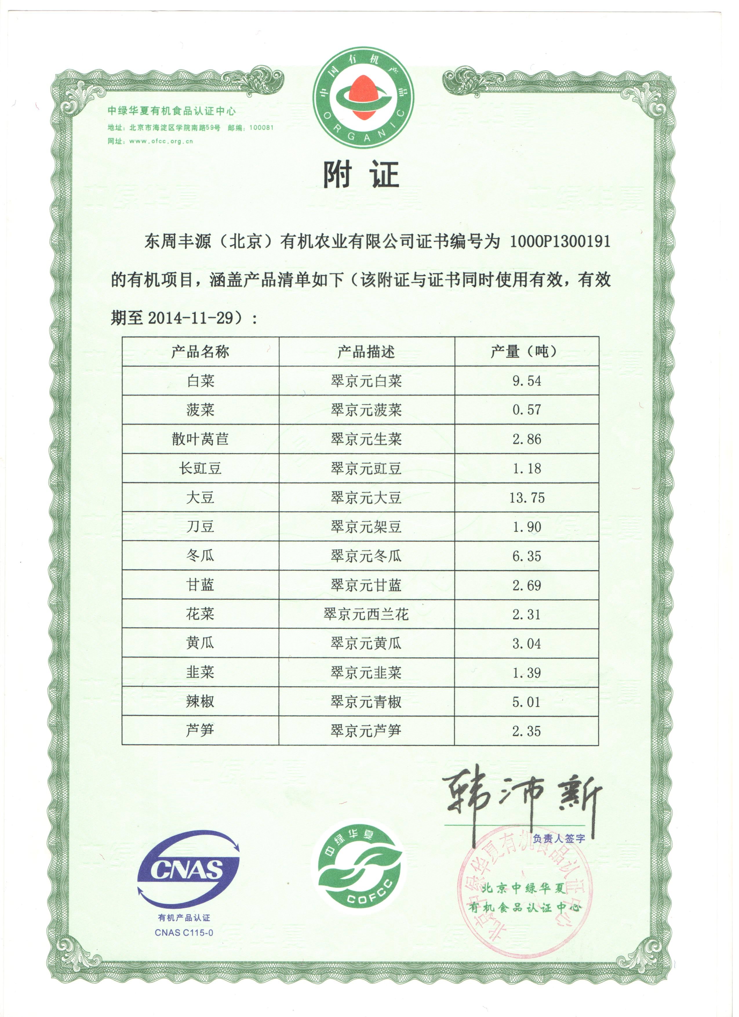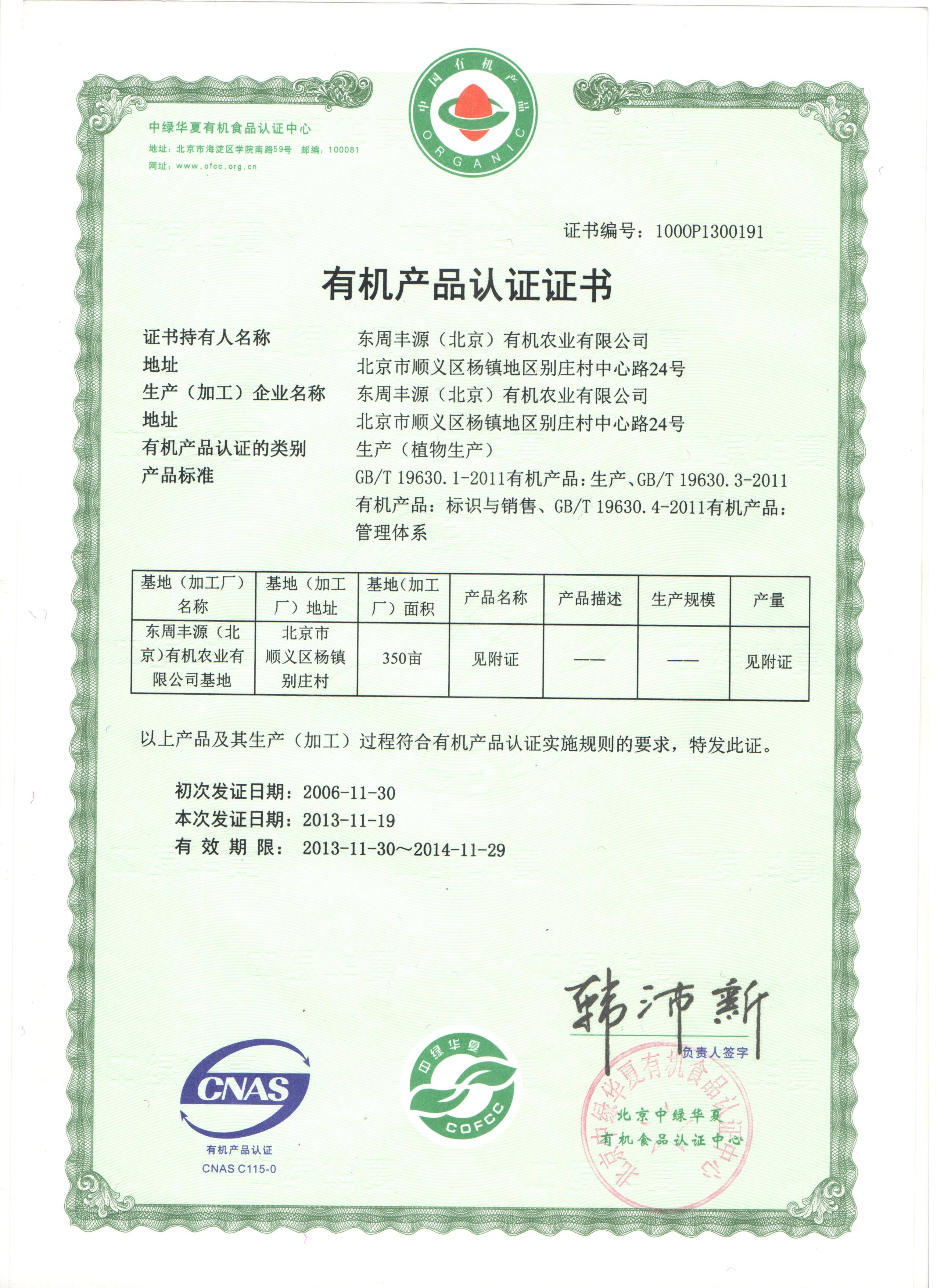公司獲得北京中綠華夏有機食品認證中心頒發(fā)的