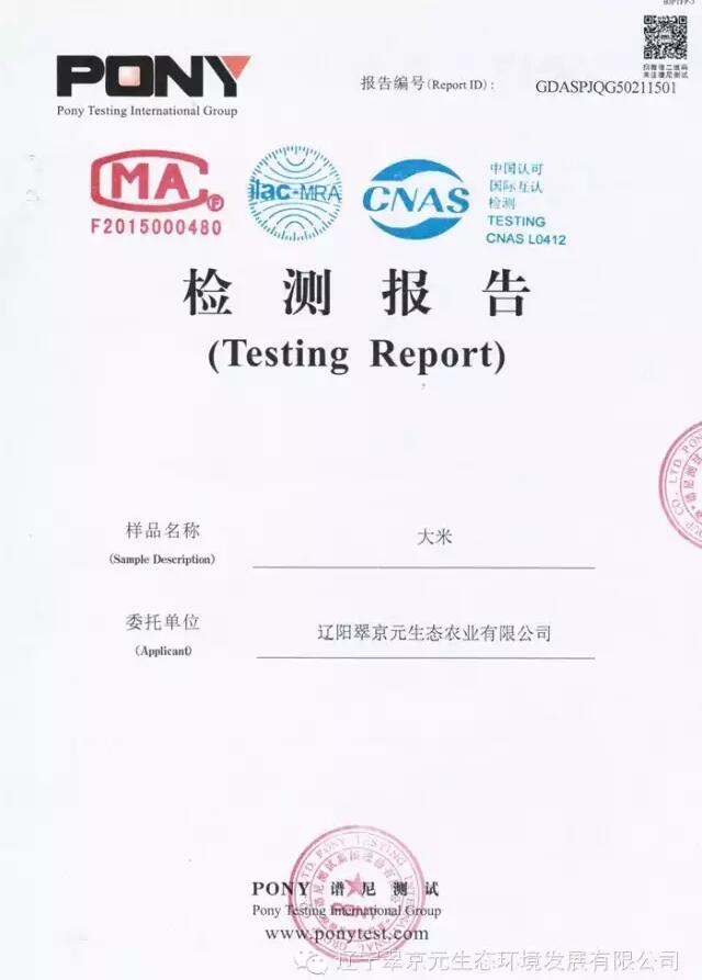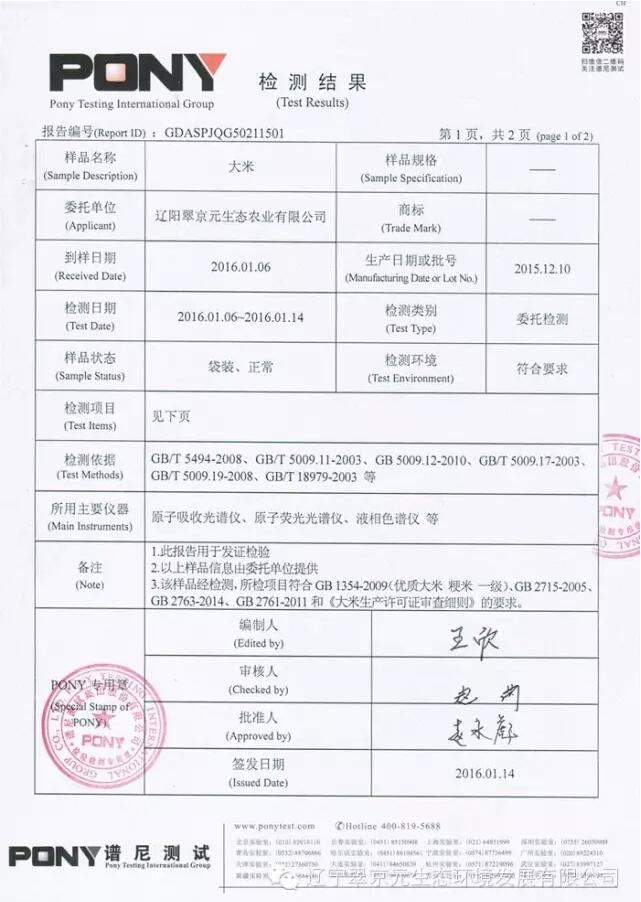 熱烈祝賀翠京元有機鴨稻米通過優(yōu)質(zhì)粳米一級標(biāo)準(zhǔn)檢測!