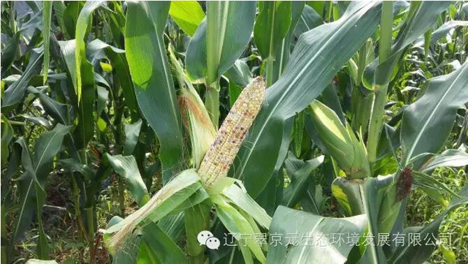 翠京元北京有農場地粘玉米,每畝底肥施用2瓶翠京元微生物菌劑和1000斤翠京元生態(tài)有機肥料,長勢健壯,結實率高,籽粒飽滿,不禿尖。