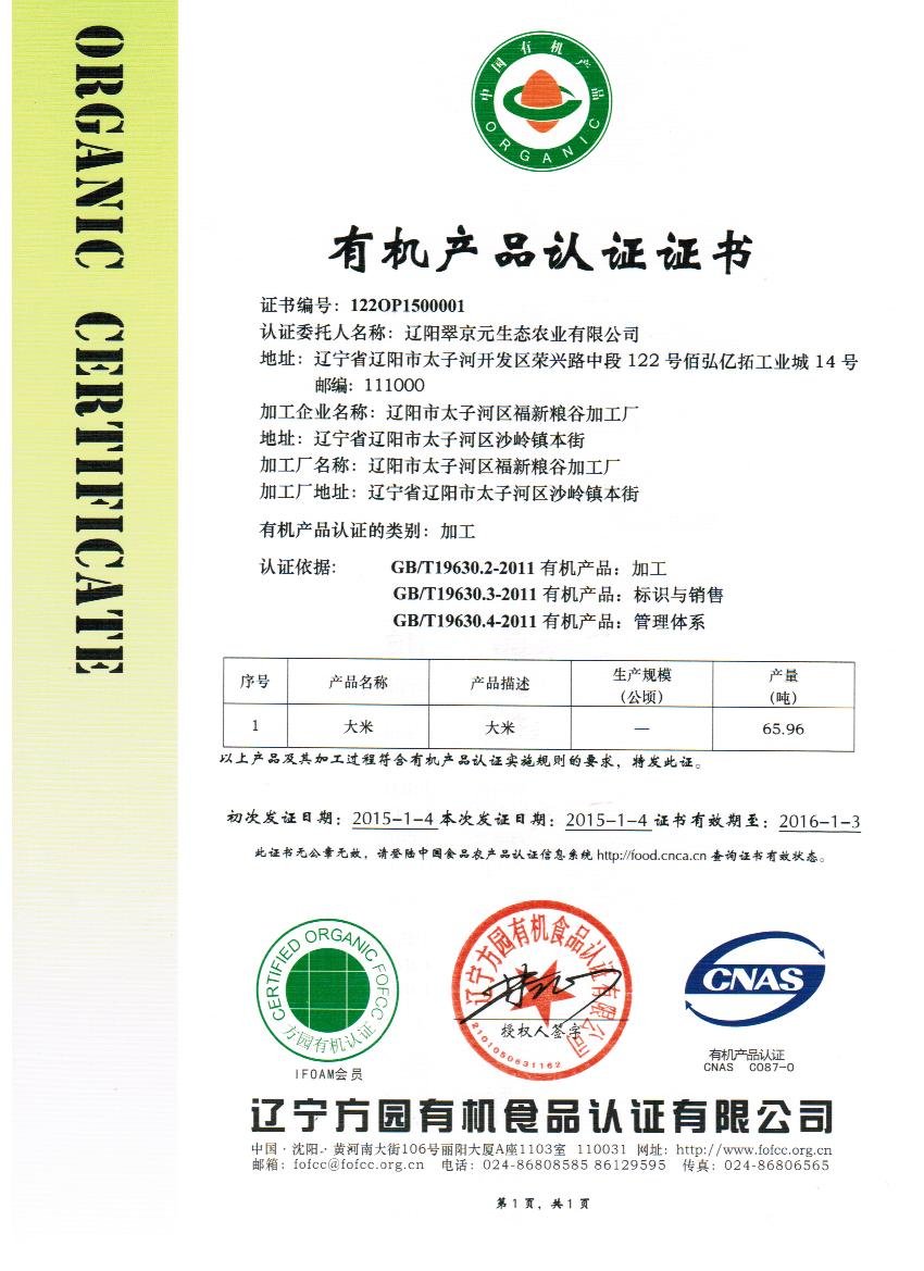 翠京元有機(jī)大米喜獲有機(jī)證書(shū)!