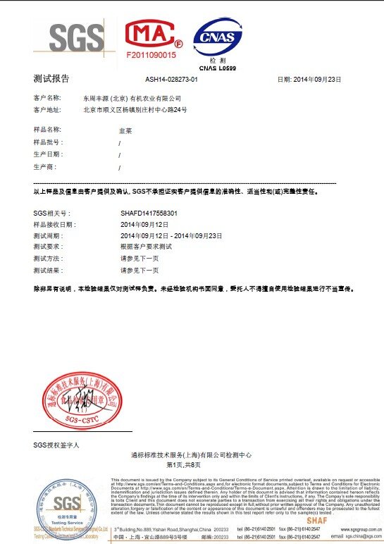 2014年9月12日,通標(biāo)標(biāo)準(zhǔn)技術(shù)服務(wù)(上海)有限公司檢測(cè)中心對(duì)東周豐源北京有機(jī)農(nóng)場(chǎng)的韭菜進(jìn)行了234項(xiàng)農(nóng)殘檢測(cè),9月23日出具了檢測(cè)報(bào)告,結(jié)果全部都是未檢出,沒有任何農(nóng)藥殘留。翠京元有機(jī)蔬果的生產(chǎn)嚴(yán)格執(zhí)行GB/T 19630-2011有機(jī)產(chǎn)品國(guó)家標(biāo)準(zhǔn),使用翠京元微生物菌劑和腐熟的農(nóng)家肥來替代化肥;不用農(nóng)藥、除草劑和化學(xué)殺蟲劑;不使用任何添加劑、色素和激素,不使用轉(zhuǎn)基因工程生物及其產(chǎn)物……而是遵循自然規(guī)律和生態(tài)學(xué)原理,采取一系列可持續(xù)發(fā)展的農(nóng)業(yè)技術(shù),協(xié)調(diào)種植平衡,維持農(nóng)業(yè)生態(tài)系統(tǒng)持續(xù)穩(wěn)定。