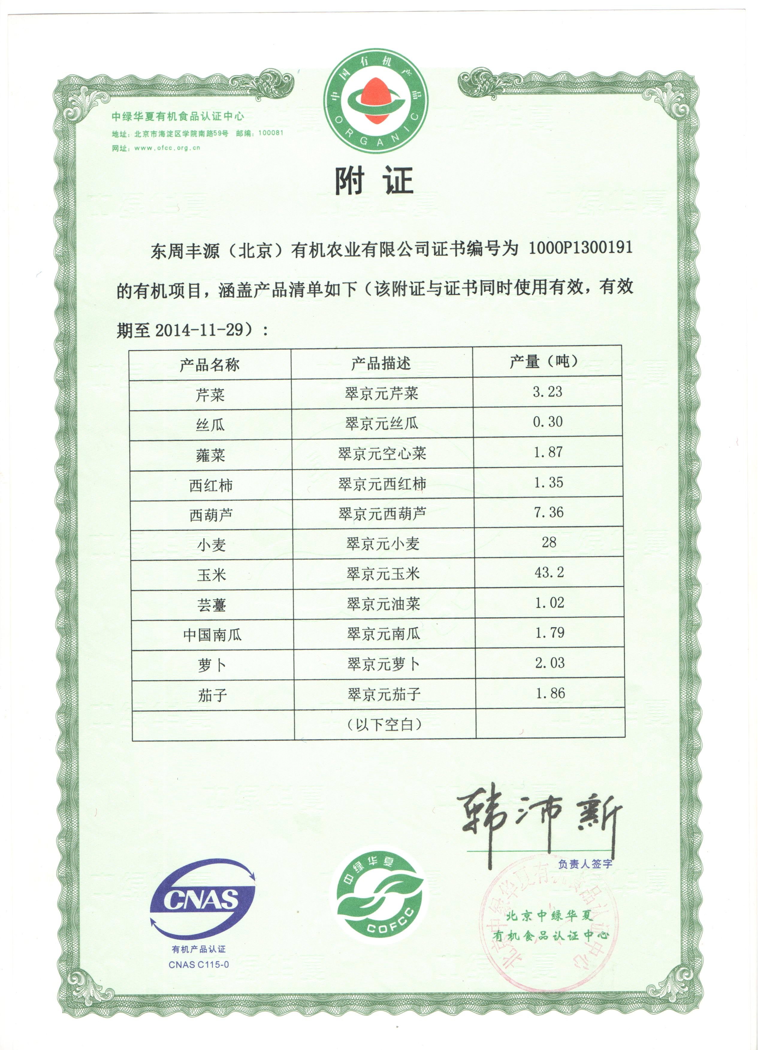 公司獲得北京中綠華夏有機食品認證中心頒發(fā)的